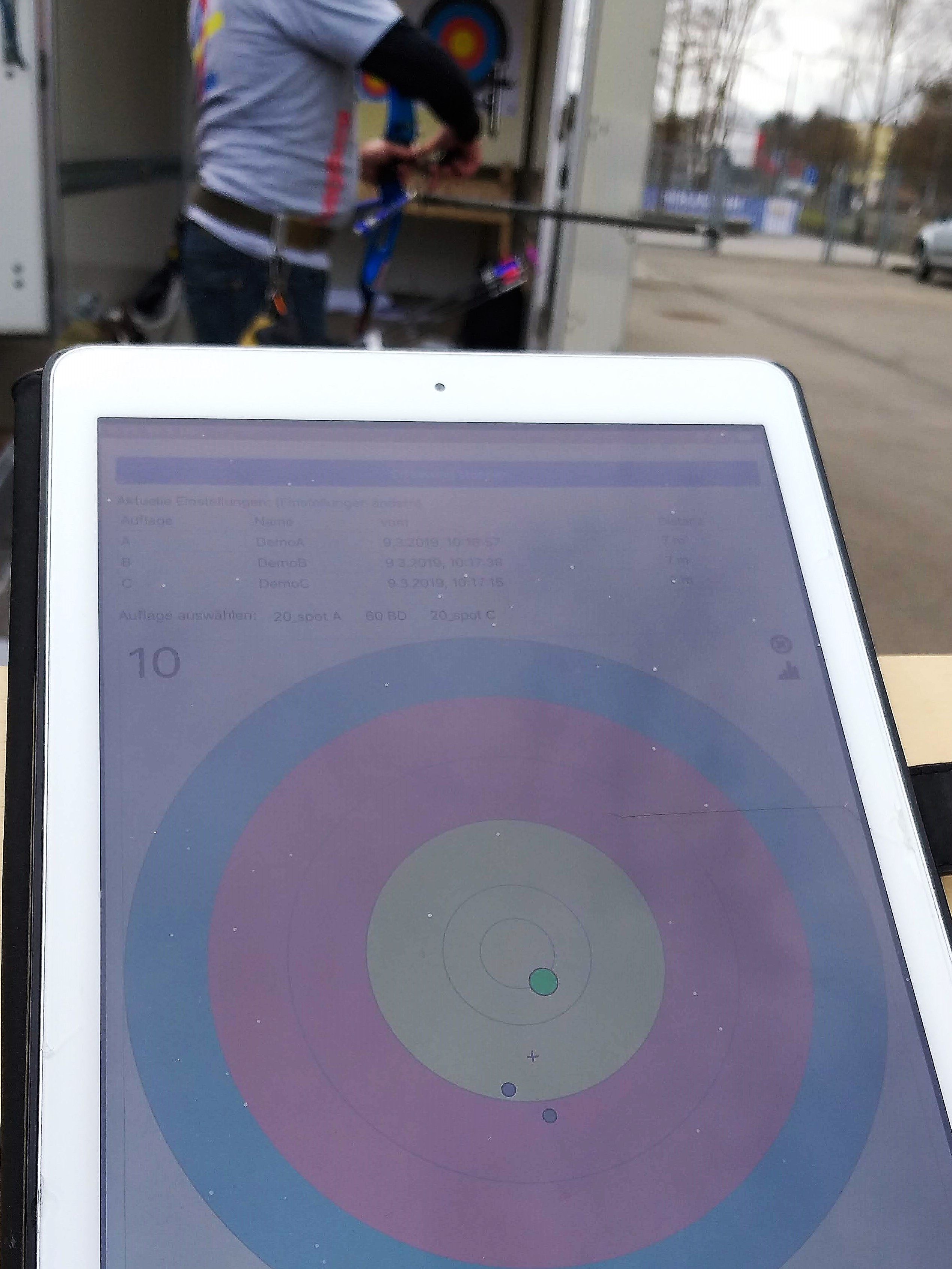 Patrick demonstrierte die automatische Pfeilerfassung mit RyngDyng. Wir hatten zuvor in die RyngDyng App die Sprachausgabe integriert, so dass unmittelbar nach jedem Treffer die Ringzahl und die Position als Stunde auf der Uhr angesagt wurde. Dieses Feature wurde sehr begrüßt. Dadurch wird es möglich, dass mehrere Schützinnen und Schützen zugleich an der Schießlinie stehen können und das unmittelbare Feedback zu ihrem Treffer erhalten. Die Trainer können sich auf die Körperhaltung etc. konzentrieren (anstatt als Spotter alle Pfeile anzusagen). Das Feedback nach jedem Schuss ist wichtig, um sogleich Korrekturen an der Haltung oder am Schussablauf vornehmen zu können.
