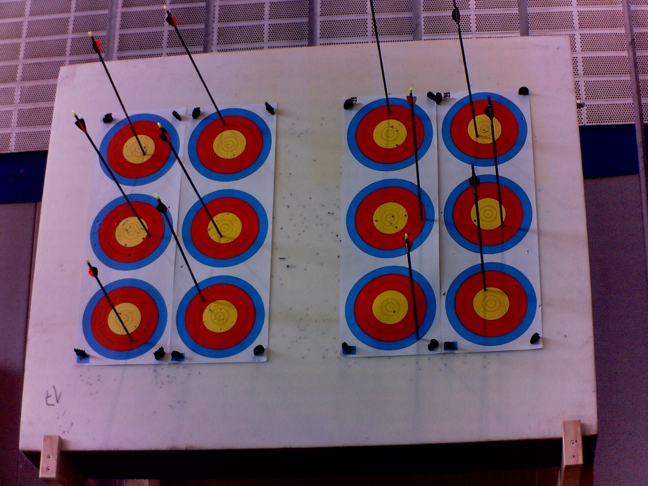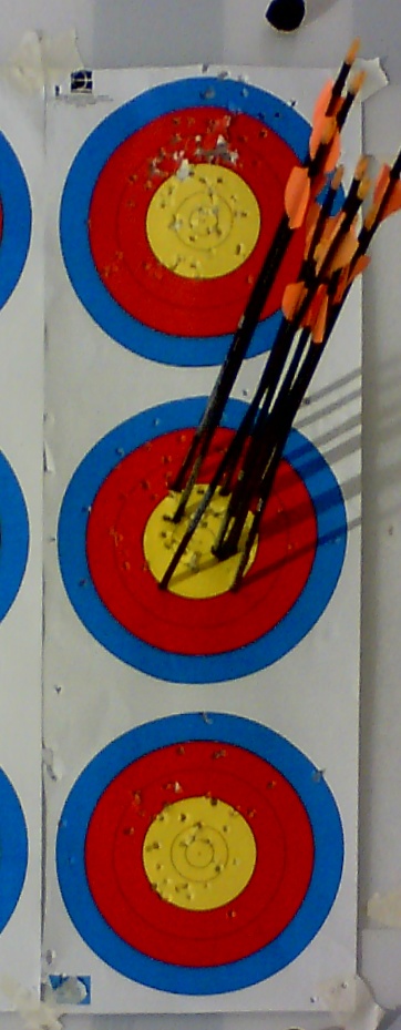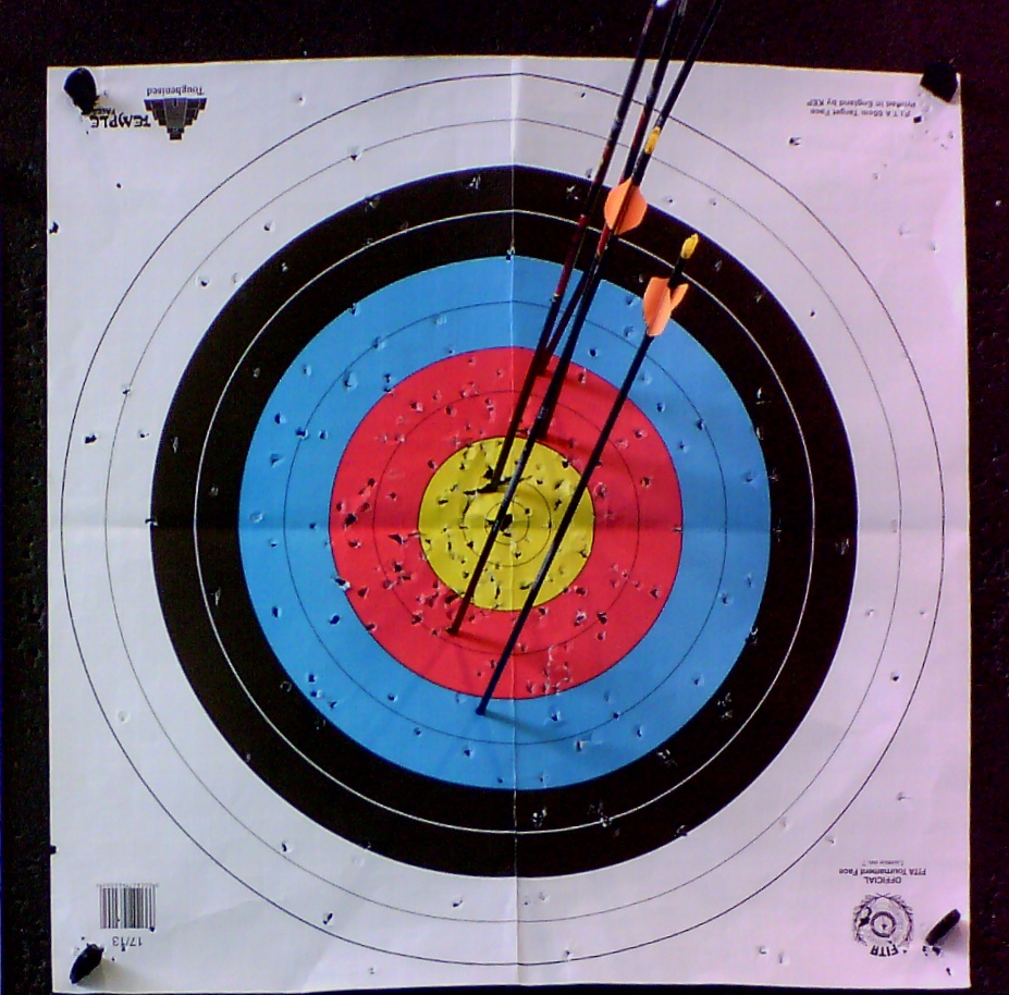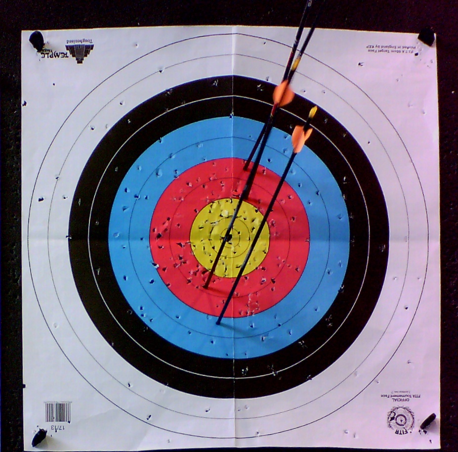 Braucht RyngDyng immer neue, unbeschädigte Auflagen? Alles hat seine Grenzen, aber RyngDyng arbeitet sehr zuverlässig mit beschossenen Auflagen. Im Beispiel sieht man an einer 40 er Auflage, dass der letzte Pfeil in einem 'Loch' steckt und trotzdem korrekt gewertet wird: