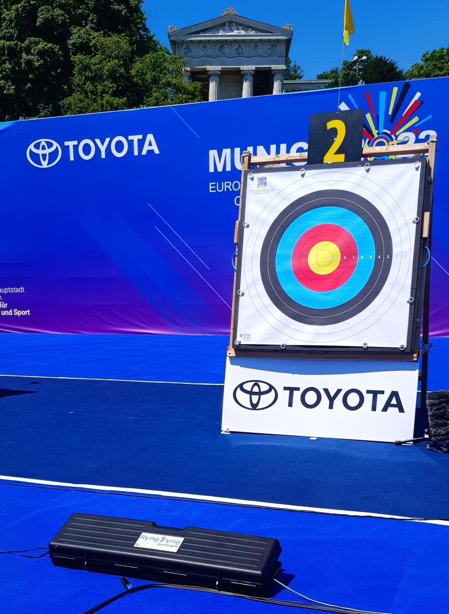 Auf der EM Munich 2022 waren wir zum ersten Mal mit einem eigenen Stand vor Ort und konnten RyngDyng den Teilnehmern vorführen. Das Interesse war sehr groß. Wie immer hat RyngDyng überzeugt und im FInale auf der Theresienwiese alle Pfeile der Finalrunden ausgewertet. Der gemessene Score wurde innerhalb einer Sekunde auf die Anzeigetafeln gebracht und live im TV gestreamt.