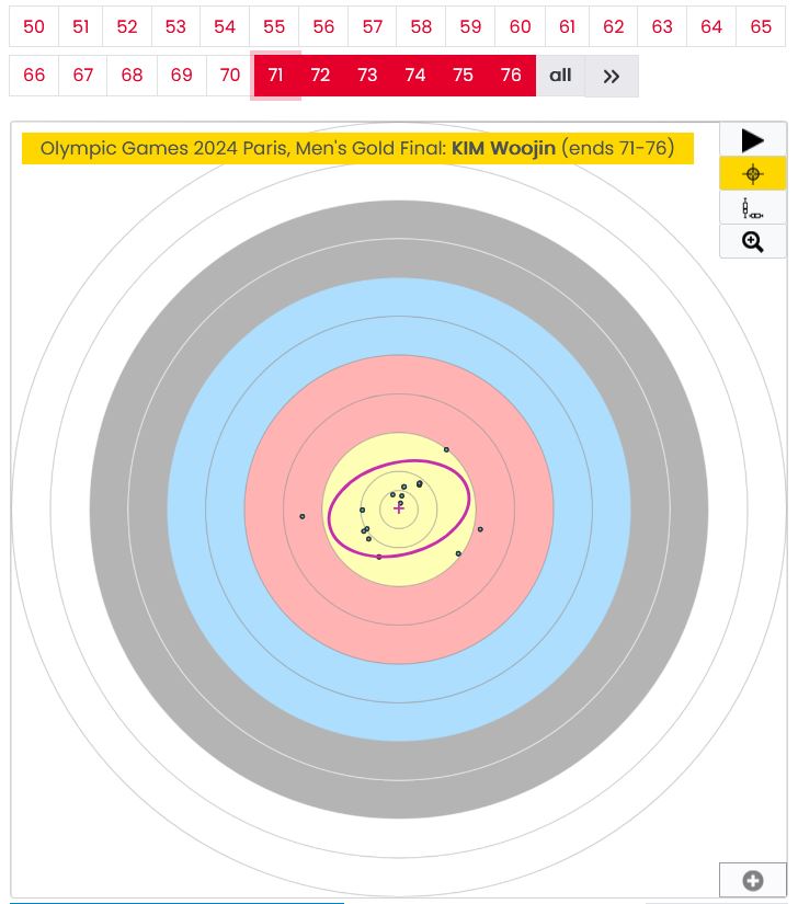 Durch klicken auf die Passe-Nummern werden diese zu einem einzigen Bild überlagert (im Beispiel oben: Passen 71-76). Unter der Auflage findest Du alle statistischen Kennzahlen zu den jeweils angezeigten Pfeilen. So kann man die Sportlerinnen und Sportler bestens vergleichen. Um es bis in die Finals zu schaffen, brauchte man einen AGI von mindestens 95 (Gruppierungswert). Manche Teilnehmer schafften 98!