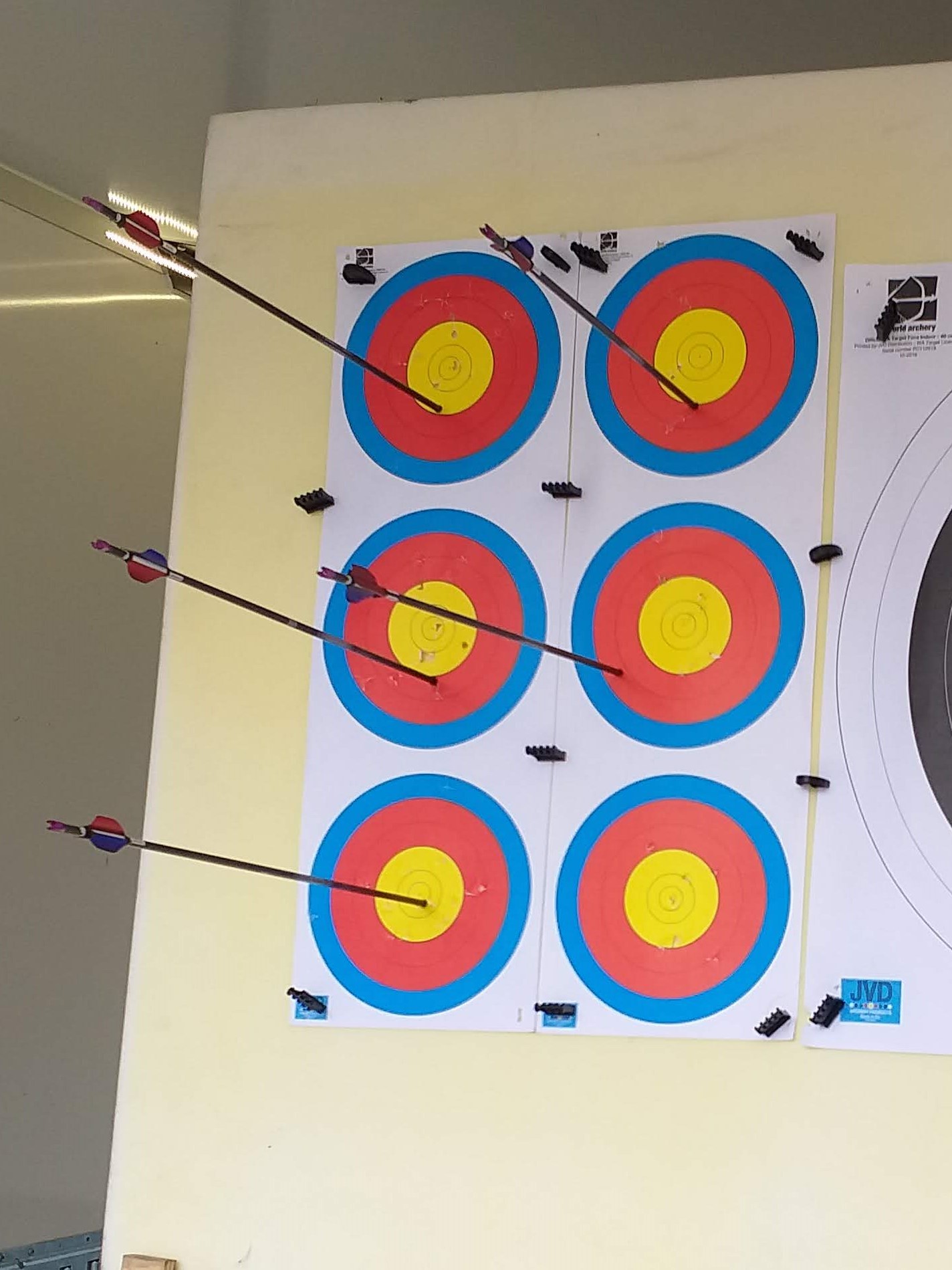 Hier seht Ihr eine Situation aus dem letzten Hallentraining mit 4 3er Spots. Das erste Bild zeigt die Kalibrierung des RyngDyng für diese Auflagen. Das zweite Bild zeigt eine Passe während des Trainings. Alle diese Pfeile wurden erkannt und aufgezeichnet. Dabei spielt es für RyngDyng keine Rolle, ob diese Pfeile gleichzeitig oder nacheinander eintreffen.