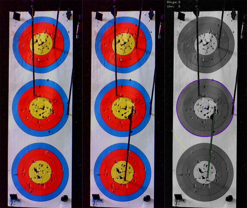 Wir führten einen Performance Test durch, bei dem 11 Pfeile auf einen Spot mit 20cm Durchmesser geschossen wurden. RyngDyng hat alle Pfeile korrekt erkannt. Im ersten Bild seht Ihr die Sicht der linken Kamera vor dem letzten Pfeil. Das zweite Bild wurde unmittelbar nach dem letzten Pfeil aufgenommen. Die Differenz zwischen beiden Bildern reicht aus, um den letzten Pfeil korrekt zu erfassen. Das Ergebnis der Berechnung im RyngDyng zeigt das dritte Bild. Der erkannte Treffer wird durch einen roten Punkt markiert.