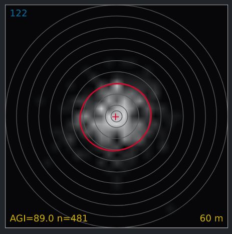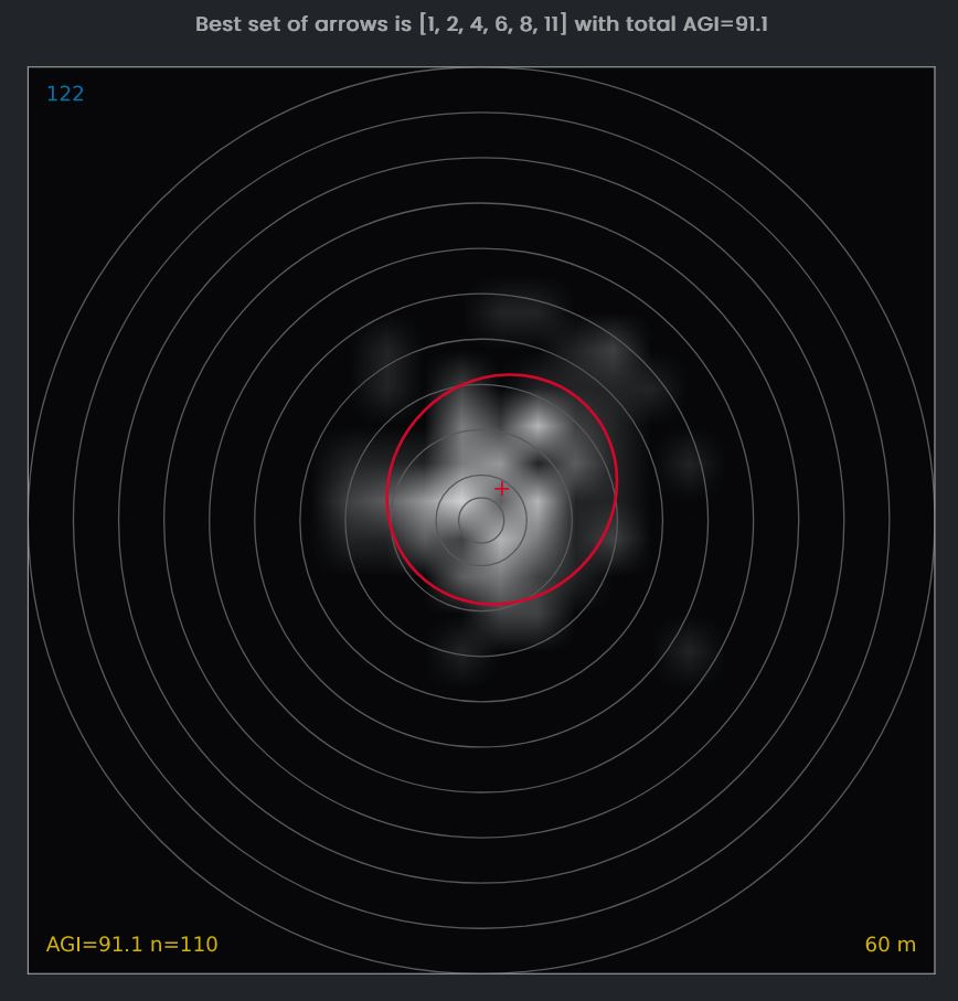 Der beste Satz Pfeile sind die Nummern 1, 2, 4, 6, 8, 11. Der AGI, der erreicht worden wäre, wenn nur diese 6 Pfeile verwendet worden wären, beträgt 91,1. Dies entspricht einer deutlich engeren Gruppierung im Vergleich zu allen 12 Pfeilen (89,0).