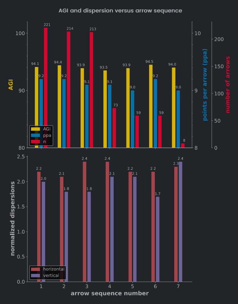 Konzentrieren wir uns auf die ersten drei Schüsse jeder Passe (Pfeilfolgenummern 1, 2 und 3). Du wirst feststellen, dass der dritte Schuss eine niedrigere Punktzahl pro Pfeil aufweist: 9,1 gegenüber 9,2 für die ersten beiden Schüsse (siehe ppa, blaue Balken). Auch der AGI-Wert (gelbe Balken) für alle 3. Schüsse ist niedriger, d. h. sie sind stärker gestreut als der erste und zweite Schuss einer Passe.