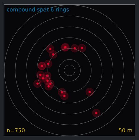Hier ist ein reales Beispiel für die Auswahl der besten Pfeile, die ein Bogenschütze mit dieser Methode durchgeführt hat. Das erste Bild zeigt alle aufgezeichneten Treffer der 12 Pfeile anhand der Streuellipsen zu Auflagentyp und Distanz Analyse. Der Filter wurde auf den passenden Tag, die verwendete Auflage (122 cm) und die verwendete Distanz (60 m) eingestellt. Es gibt 481 aufgezeichnete Pfeilpositionen mit einem AGI = 89,0.